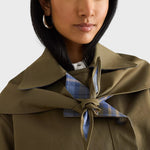 • Zmienny kołnierz: Wyrazisty kołnierz z wbudowanym wiązaniem działa jak szalik i pozwala na różne style noszenia – od swobodnie rozwiązanych po elegancko zawiązane na kokardę.