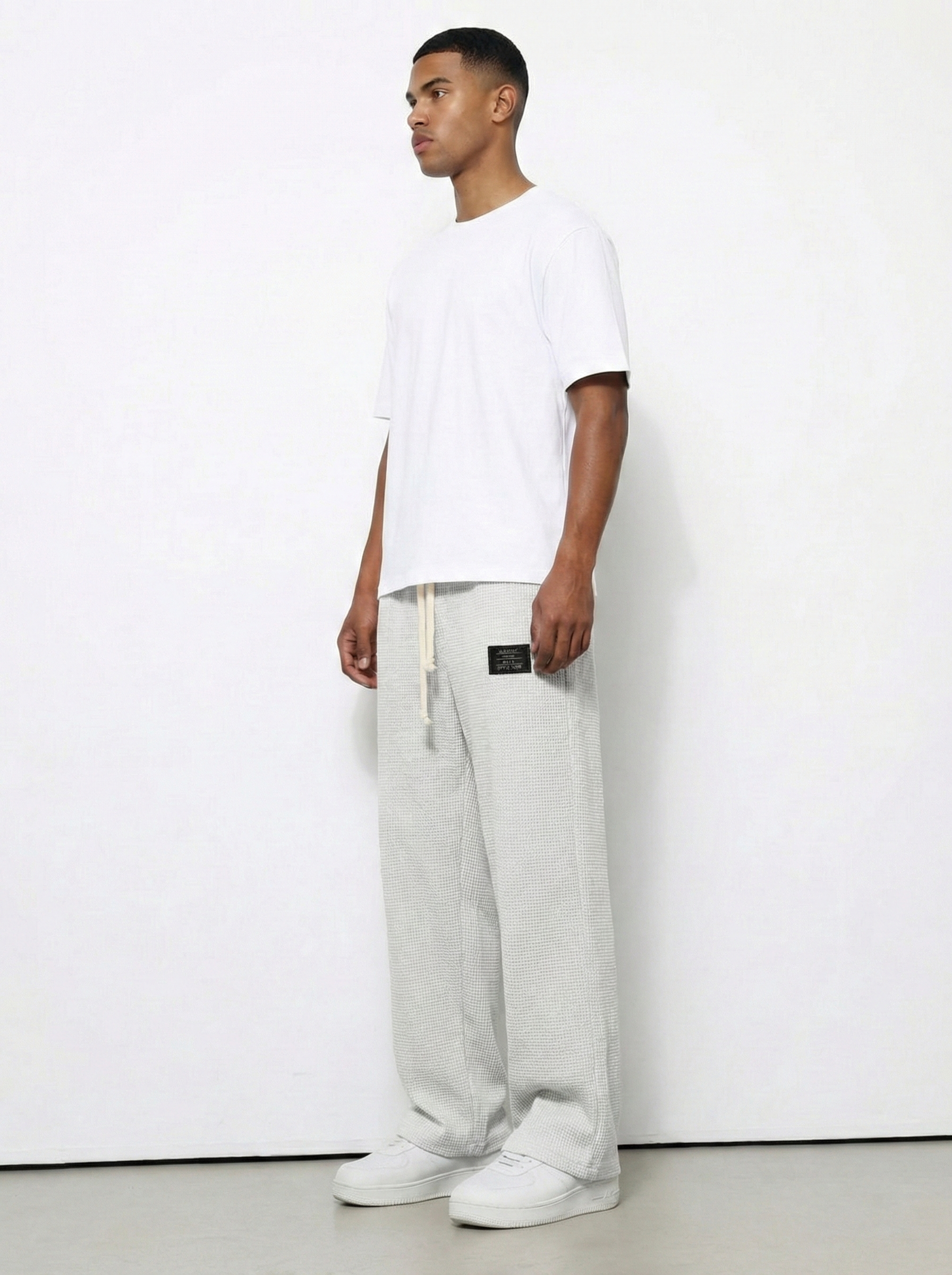 Nowoczesne detale: Stylowa naszywka i strukturalny wygląd podnoszą te dresy z "domowego ubrania" na stylowy streetwear.