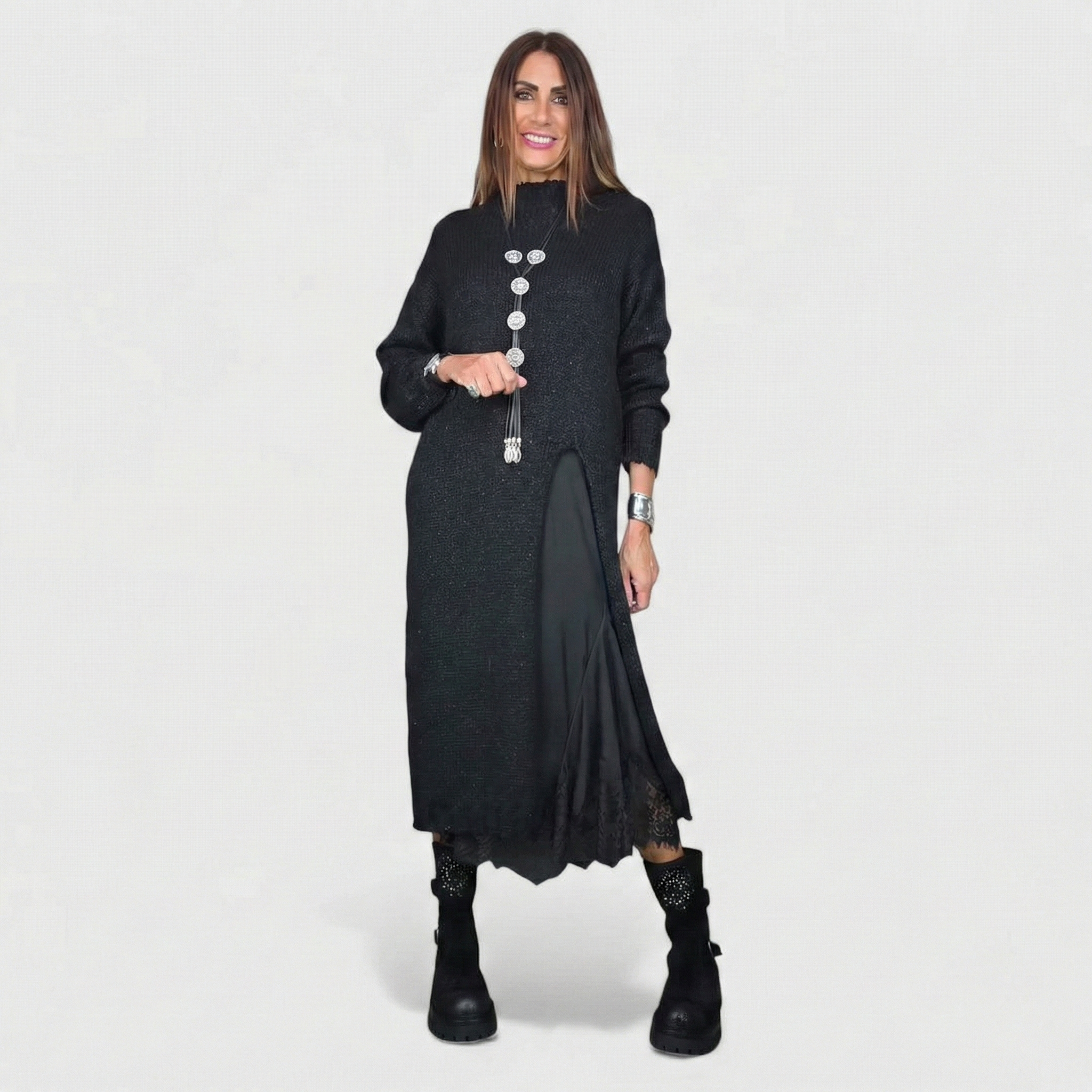 • Połączenie dwóch elementów: Długi pleciony sweter z luźną sukienką pod spodem – gotowy do noszenia.